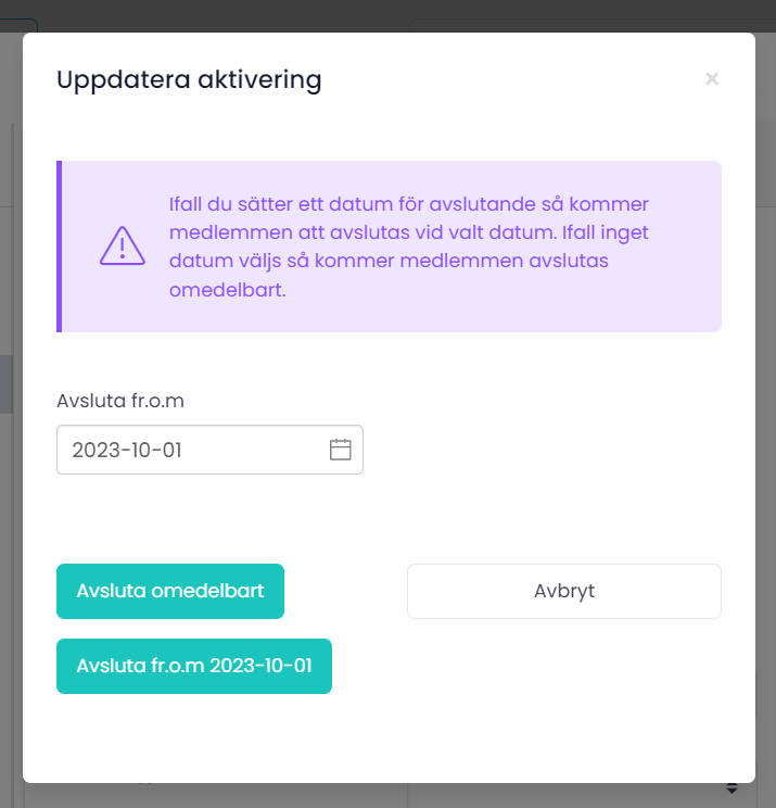 • Avsluta medlemsmodalen öppnas och här ställer man in vilket datum som medlemmen ska avslutas.Välj datum för avslutande
